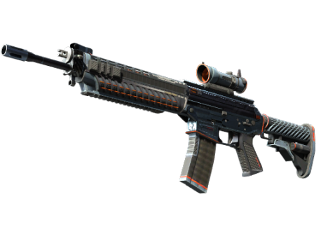 The terrorist-exclusive SG553 is a premium scoped alternative to the AK47 for effective long-range engagement. It has been hand painted with a blue and grey design and finished with orange accents.
