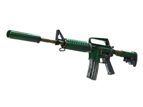 With a smaller magazine than its unmuffled counterpart, the silenced M4A1 provides quieter shots with less recoil and better accuracy. It has been custom painted with a marbled green base and finished with gold and red accents.