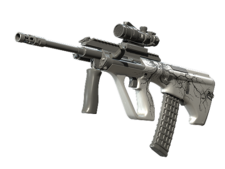 Powerful and accurate, the AUG scoped assault rifle compensates for its long reload times with low spread and a high rate of fire. It has been painted with gnarled branches and birds over a silver base.