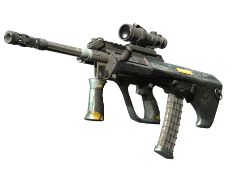 Powerful and accurate, the AUG scoped assault rifle compensates for its long reload times with low spread and a high rate of fire. Its gunmetal base coat has been finished with gold highlights, rear facing arrows, and a mischievous looking cat.