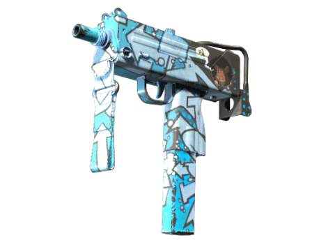 Essentially a box that bullets come out of, the MAC-10 SMG boasts a high rate of fire, with poor spread accuracy and high recoil as trade-offs. The rat near the rear sight is surrounded by black and blue graffiti.