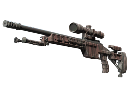 The SSG08 bolt-action is a low-damage but very cost-effective sniper rifle, making it a smart choice for early-round long-range marksmanship. It has been spray-painted with a rust colored zebra stripe pattern.