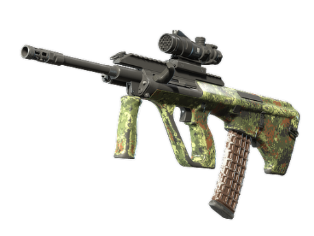 Powerful and accurate, the AUG scoped assault rifle compensates for its long reload times with low spread and a high rate of fire. A green hydrographic flecktarn camo pattern has been applied.