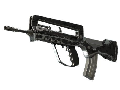 A cheap option for cash-strapped players, the FAMAS effectively fills the niche between more expensive rifles and the less-effective SMGs. It has been painted in an aquatic-stripe pattern with charcoal metallic paints of various reflectivities over a chrome base coat.