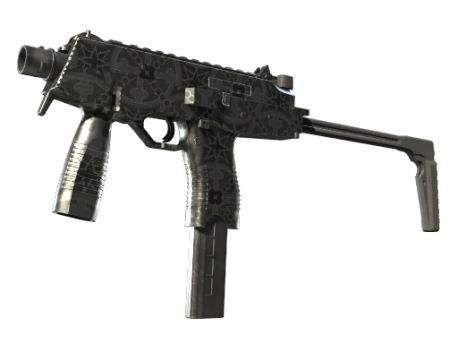 Manufactured in Switzerland, the cutting-edge MP9 SMG is an ergonomic polymer weapon favored by private security firms. It has been painted with metallic paints to look as though it has been inlaid with metals in a medieval motif.