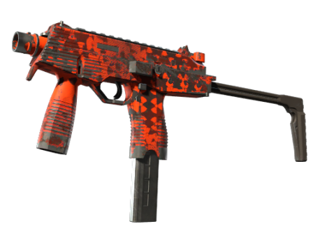 Manufactured in Switzerland, the cutting-edge MP9 SMG is an ergonomic polymer weapon favored by private security firms. It has been painted with a hydrographic pattern of nuclear hazards symbols.