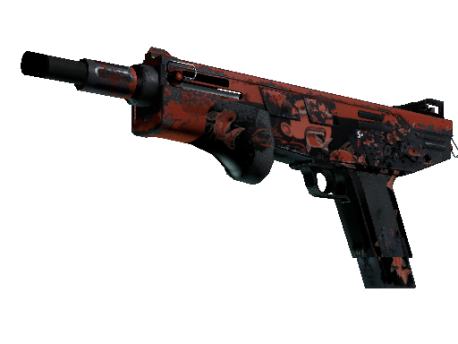 The CT-exclusive Mag-7 delivers a devastating amount of damage at close range. Its rapid magazine-style reloads make it a great tactical choice. It has been custom painted with a design depicting fish swimming into a person's mouth using an orange and black color palette.