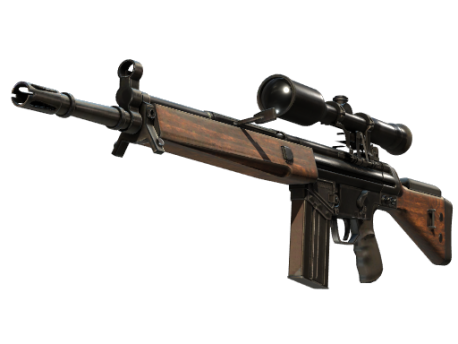 The pricy G3SG1 lowers movement speed considerably but compensates with a higher rate of fire than other sniper rifles. The gun's black base has been covered with dark wood paneling.