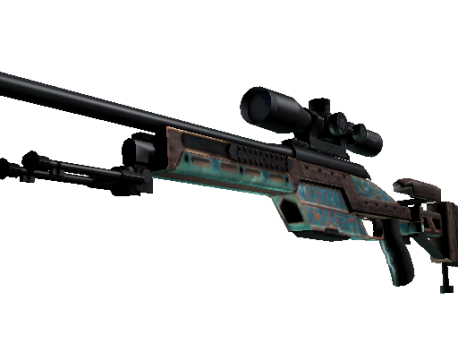 The SSG08 bolt-action is a low-damage but very cost-effective sniper rifle, making it a smart choice for early-round long-range marksmanship. It has been custom painted with blue water, Egyptian hieroglyphs, and finished with wood running the length of the weapon.
