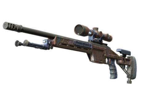 The SSG08 bolt-action is a low-damage but very cost-effective sniper rifle, making it a smart choice for early-round long-range marksmanship. A blush, gold, and blue-colored acrylic pour pattern has been applied.