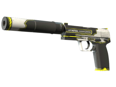 A fan favorite from Counter-Strike Source, the Silenced USP Pistol has a detachable silencer that gives shots less recoil while suppressing attention-getting noise. It has been custom painted in a modern black, white and yellow design.