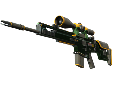 The SCAR-20 is a semi-automatic sniper rifle that trades a high rate of fire and powerful long-distance damage for sluggish movement speed and big price tag. It has been custom painted in green with yellow accents, then given a USB code for quick checkout.