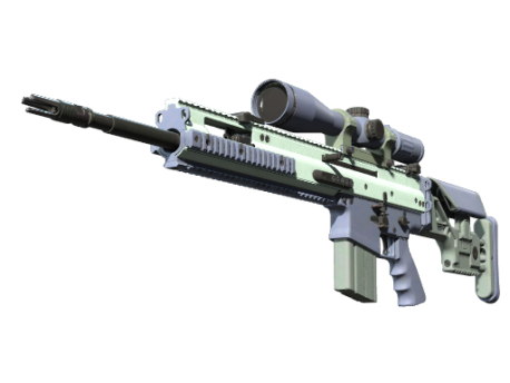 The SCAR-20 is a semi-automatic sniper rifle that trades a high rate of fire and powerful long-distance damage for sluggish movement speed and big price tag. It has individual parts spray-painted solid colors in a stormy color scheme.