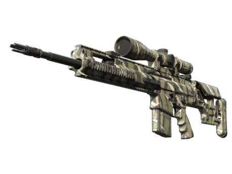 The SCAR-20 is a semi-automatic sniper rifle that trades a high rate of fire and powerful long-distance damage for sluggish movement speed and big price tag. It has been spray-painted with a randomized stripe pattern.