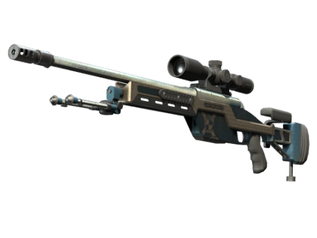 The SSG08 bolt-action is a low-damage but very cost-effective sniper rifle, making it a smart choice for early-round long-range marksmanship. It has been hand painted with blue and white checkerboard patterns.