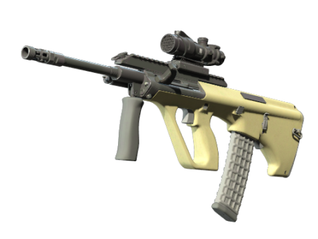 Powerful and accurate, the AUG scoped assault rifle compensates for its long reload times with low spread and a high rate of fire. It has individual parts spray-painted khaki and grey.