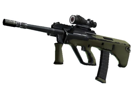 Powerful and accurate, the AUG scoped assault rifle compensates for its long reload times with low spread and a high rate of fire. It has individual parts spray-painted khaki and grey.