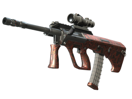 Powerful and accurate, the AUG scoped assault rifle compensates for its long reload times with low spread and a high rate of fire. A red circuit board pattern has been applied over a black base.