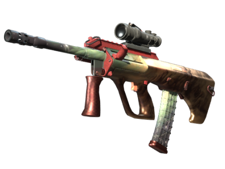 Мощная и точная винтовка с оптическим прицелом AUG компенсирует свою долгую перезарядку низким разбросом пуль и высокой скорострельностью. На оружие нанесено изображение песчаной бури под ночным небом.