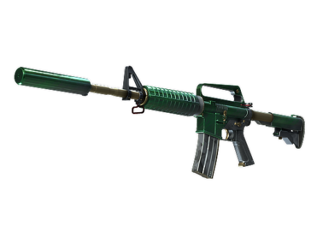 With a smaller magazine than its unmuffled counterpart, the silenced M4A1 provides quieter shots with less recoil and better accuracy. It has been custom painted with a marbled green base and finished with gold and red accents.