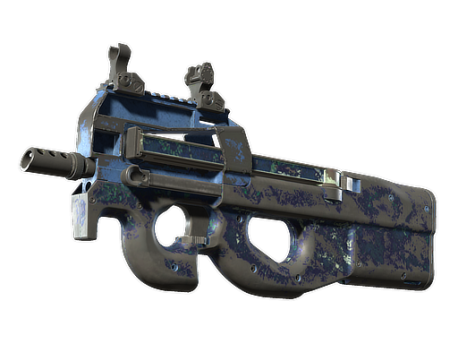 P90 легко узнать по уникальному дизайну под названием «булл-пап». Это оружие великолепно подходит для стрельбы на ходу благодаря высокой ёмкости магазина и низкой отдаче. A green and blue coral pattern has been applied.