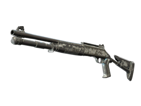 XM1014 — это мощный, полностью автоматический дробовик, который оправдывает свой здоровенный размер возможностью быстро нашпиговать комнату свинцом. Баллончиком нанесены узоры из чёрных и синих следов от протектора покрышки.