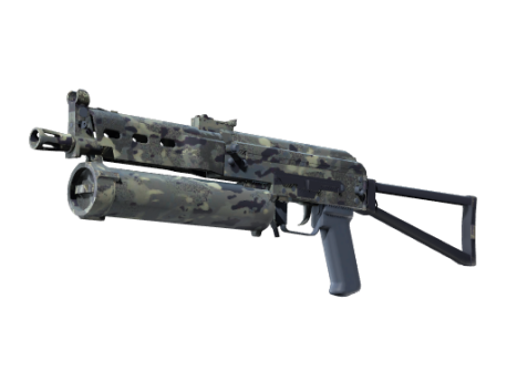 The Bizon SMG is low-damage, but offers a uniquely designed high-capacity drum magazine that reloads quickly. It has been painted using a VariCamo patterned hydrographic.