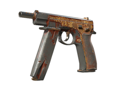 A fully automatic variant of the CZ75, the CZ75-Auto is the ideal short-term choice for turning the tables and gaining your opponents weapon. But with very little ammo in the magazine, strong trigger discipline is required. It has been painted with a gold-colored paisley pattern over a wine-colored base.