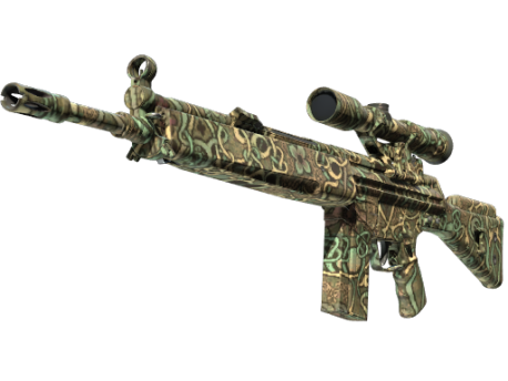 The pricy G3SG1 lowers movement speed considerably but compensates with a higher rate of fire than other sniper rifles. It has been spray-painted with a vine and flower pattern in various shades of green.